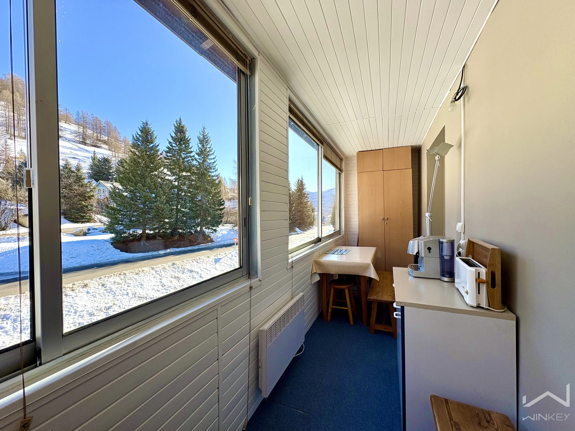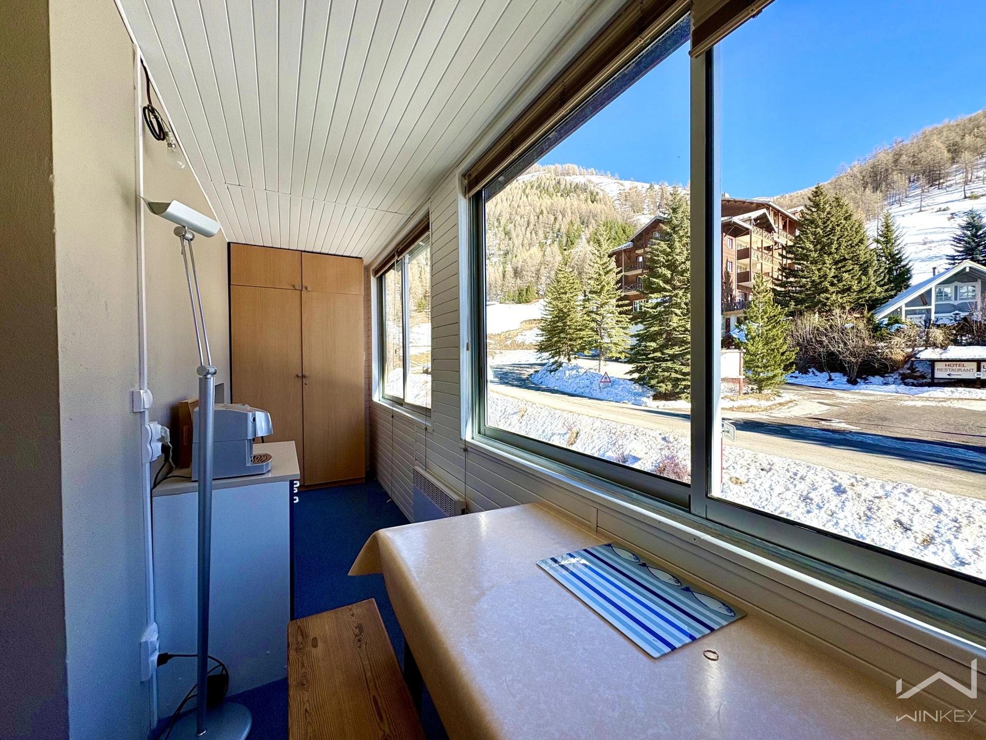 d'une loggia fermée faisant office de véritable pièce pour les repas, offrant une vue dégagée sur la montagne.