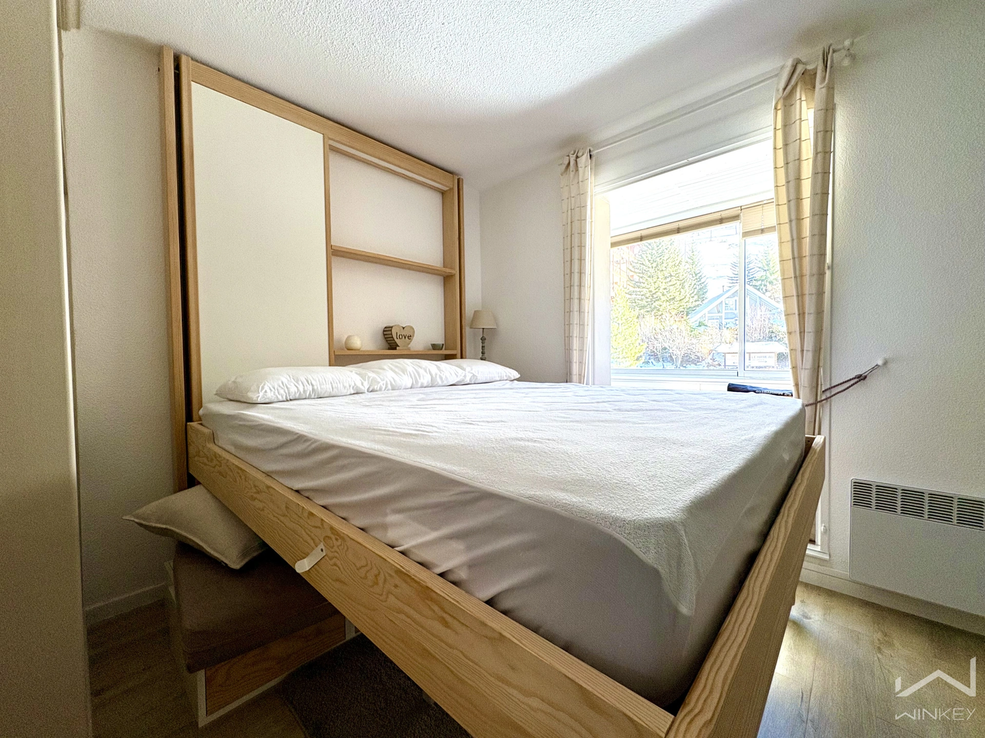 d'un lit escamotable en 160 cm, système ingénieux de remontée au plafond pour libérer la pièce de vie,