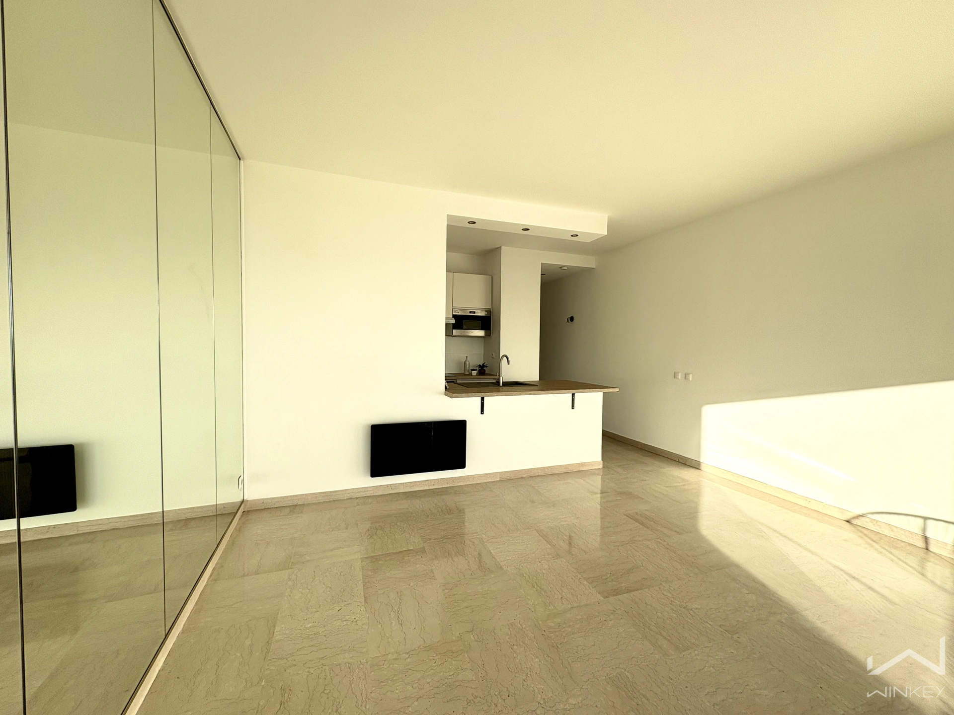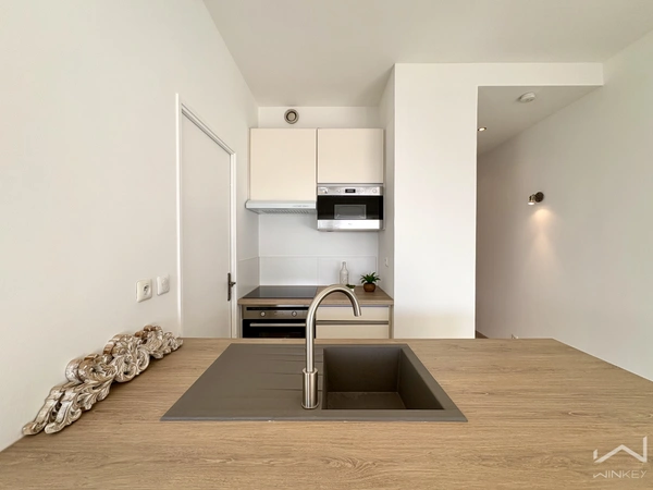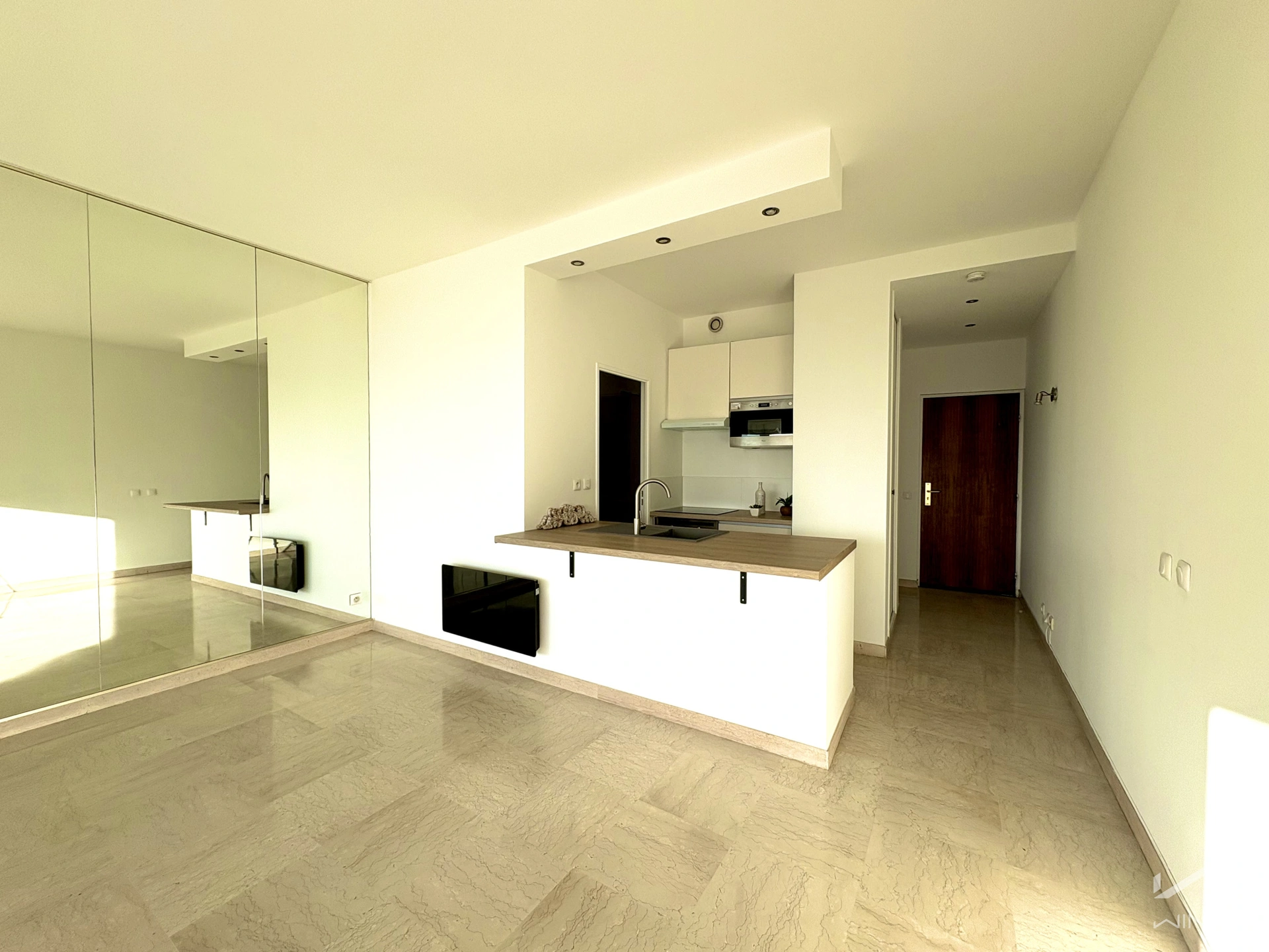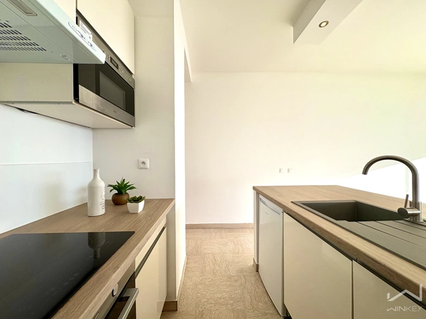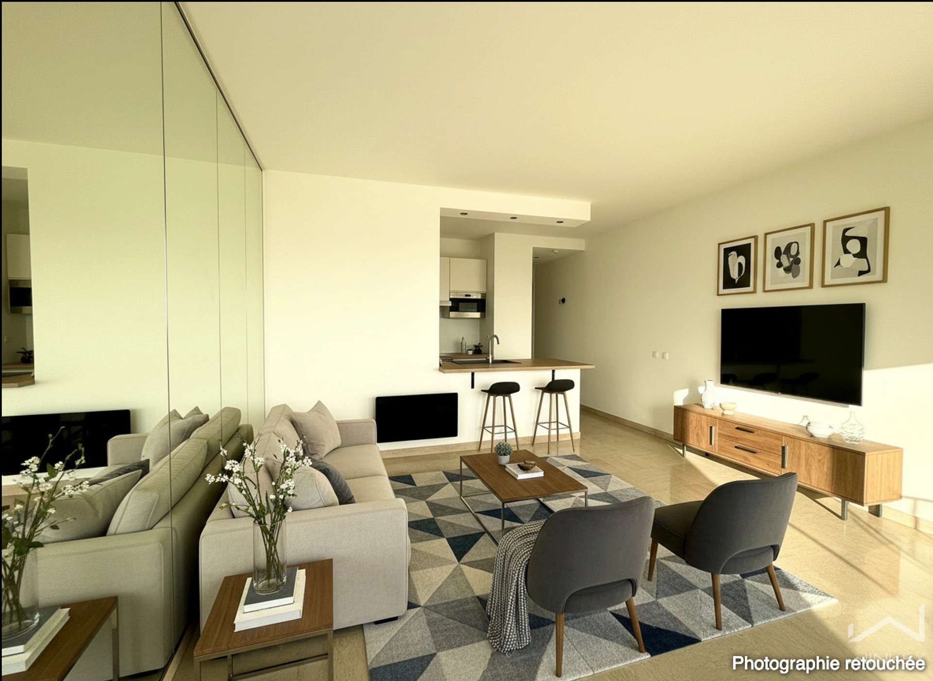 Pièce de vie baignée de lumière, intégrant une cuisine équipée